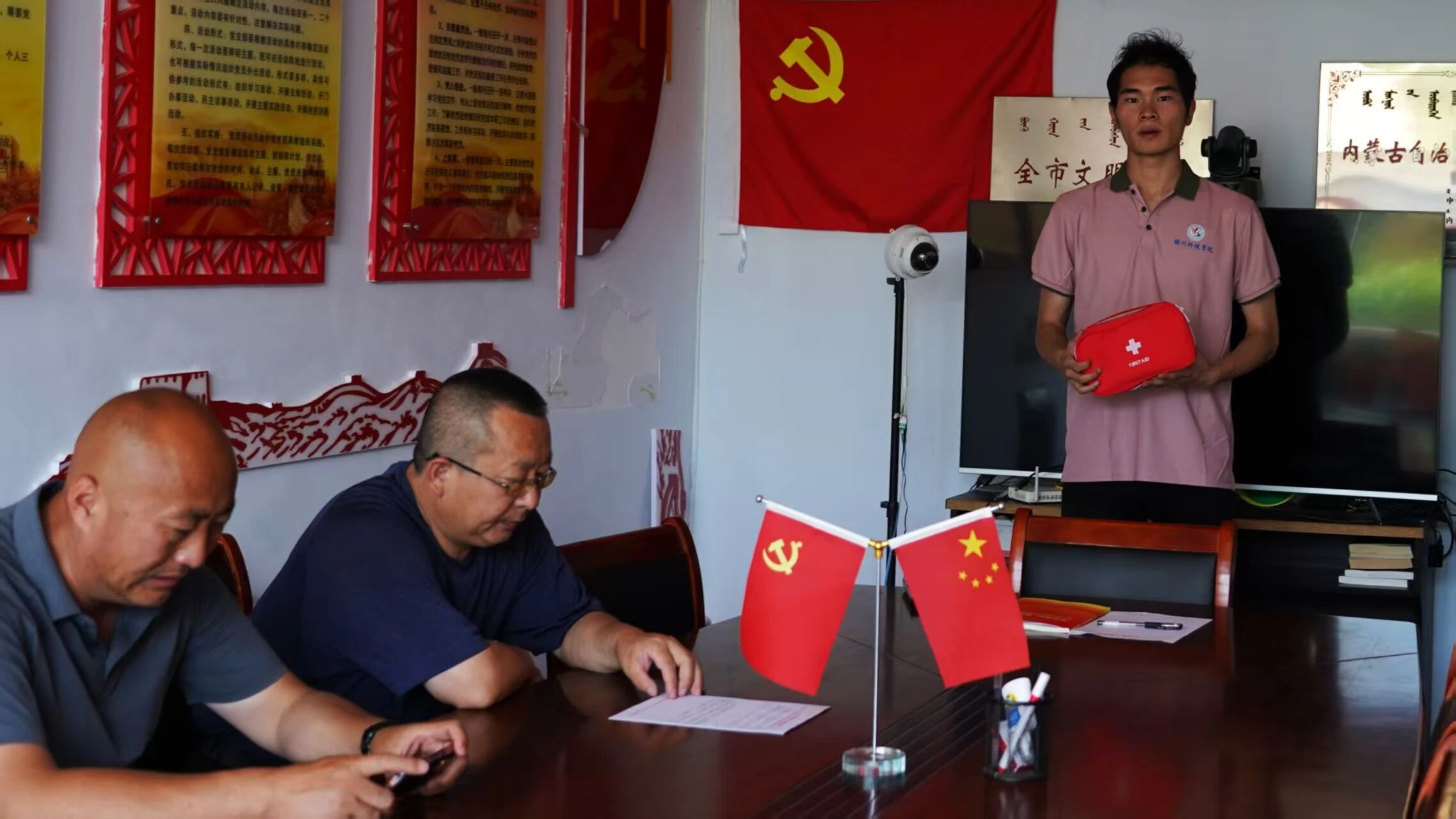 由退伍军人张守宝和中国红十字协会专业人士王玥博主讲,构建“理论讲解+情景模拟+蒙汉双语互动”急救教学体系,普及中暑、创伤、异物梗阻处理及心肺复苏、海姆立克法等知识,王立松同志提供翻译。